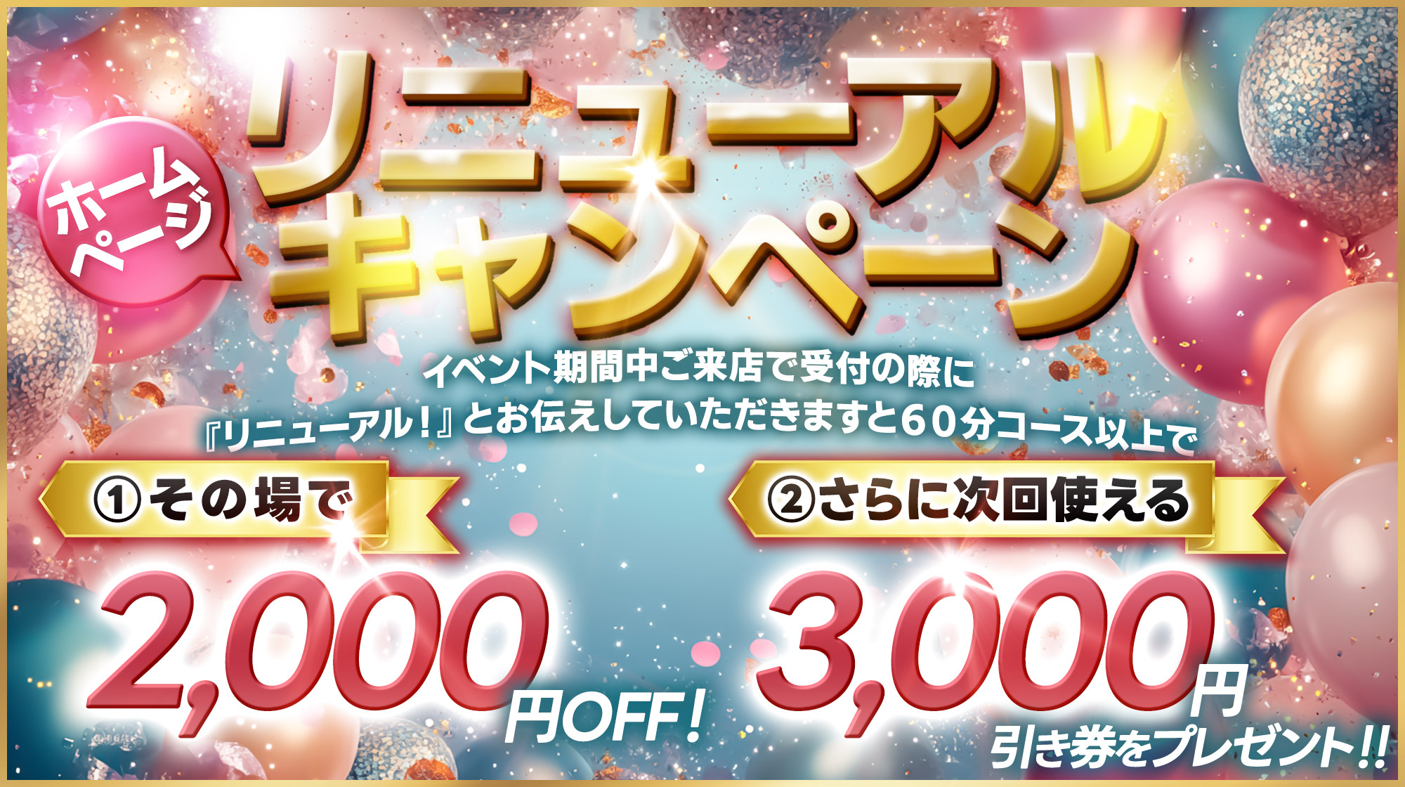 受付所にお越しの際に『リニューアル!』とお伝えしていただきますと60分コース以上で