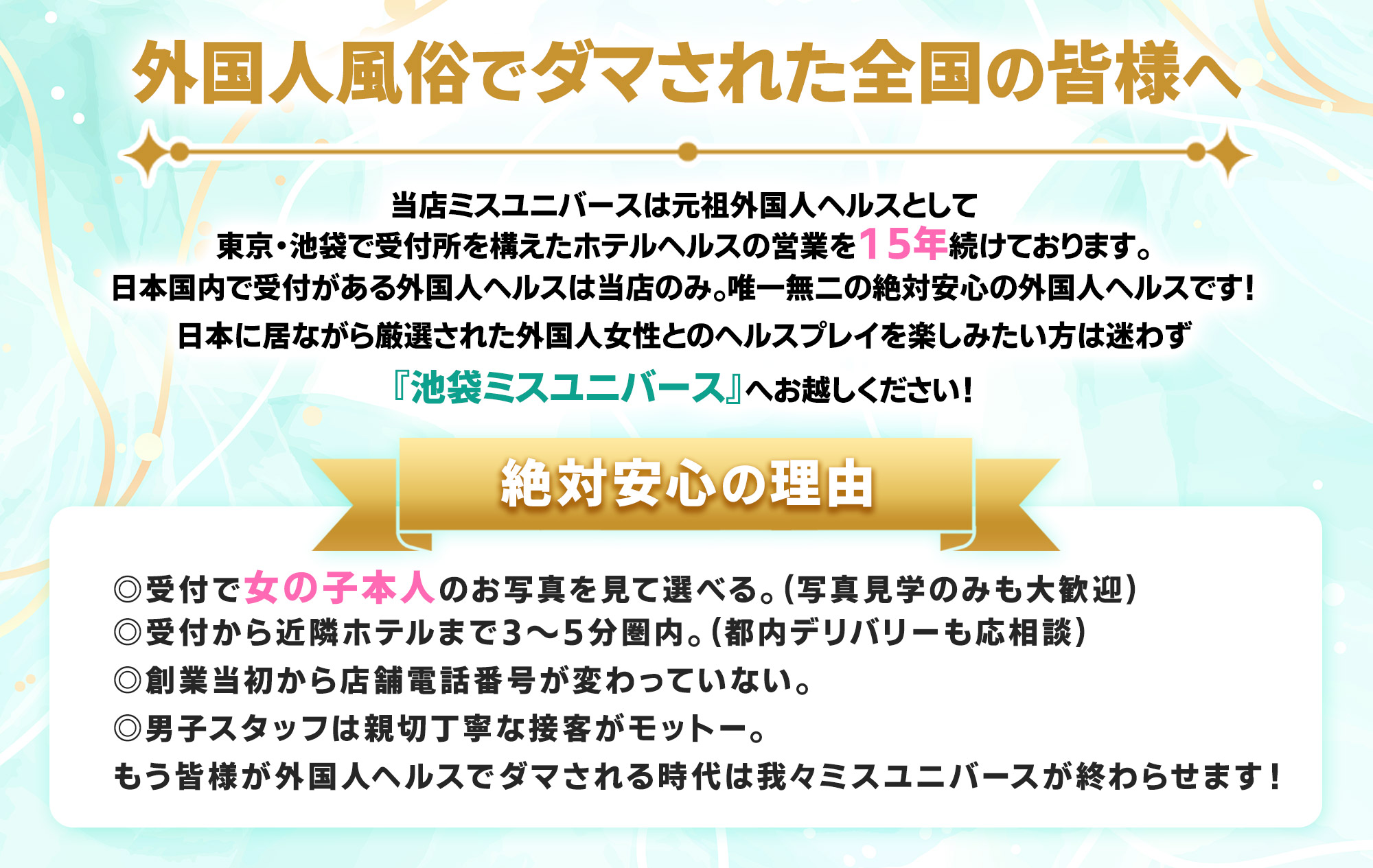 最近、外国人女性のグラビア画像サイト等から勝手に写真を流用して、それらをあたかも在籍してるように架空のコンパニオンとして掲載しお客様を騙す悪質外国人デリヘルが都内や全国各地に相当数営業しておりますので、外国人風俗遊びを考えてるお客様は十分ご注意ください!被害に遭われてる方が多数いらっしゃるようです。