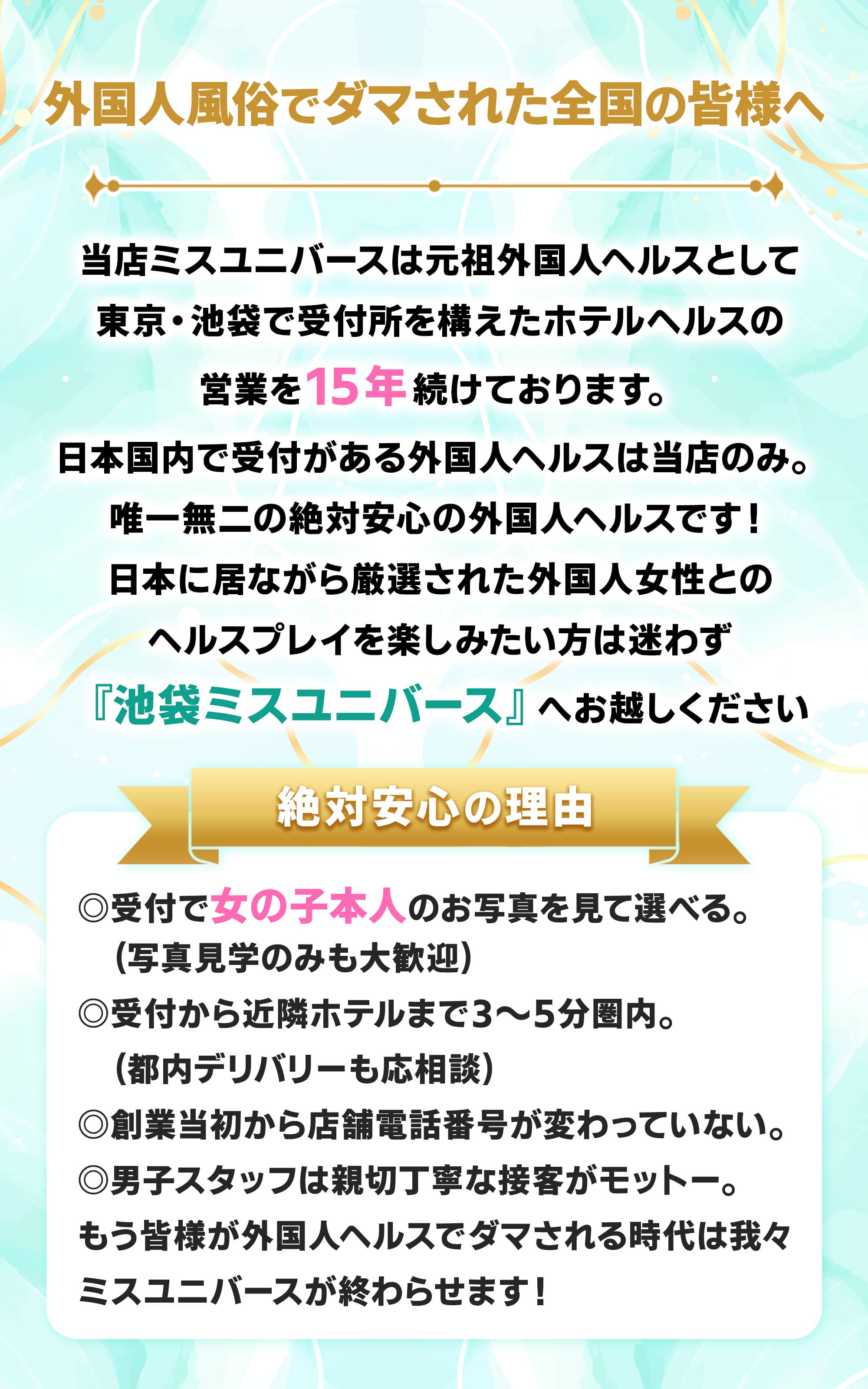 当店は日本で唯一の受付所型の営業、そして写真も100%本人のものですので、ご安心してお遊び下さいませ。